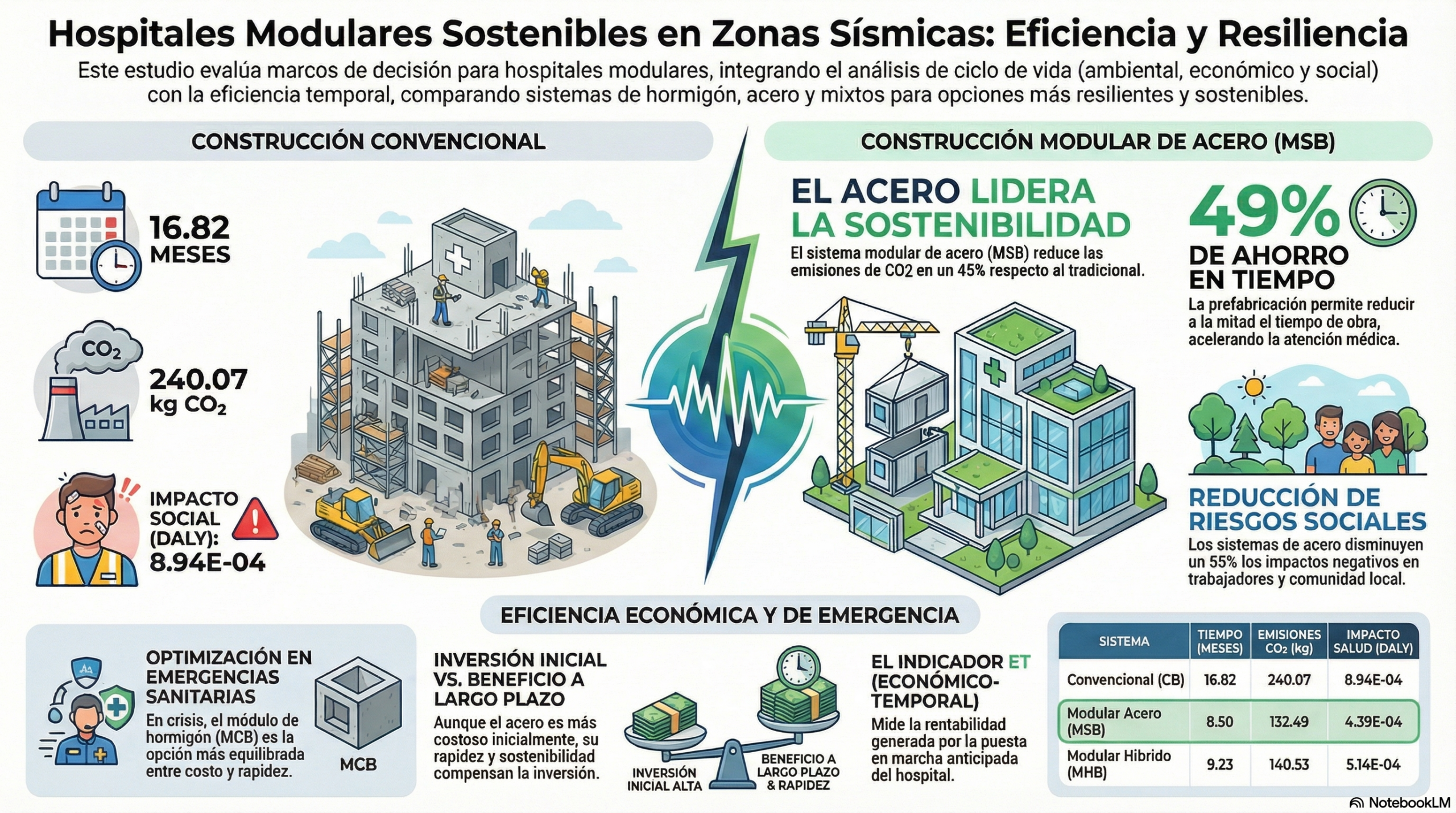 La investigación aborda el estancamiento de la productividad en el sector de la construcción y la necesidad crítica de desplegar rápidamente servicios sanitarios mediante la evaluación de sistemas de edificios modulares volumétricos prefabricados. El marco integra, de manera inédita, cuatro dimensiones: Evaluación del Ciclo de Vida (LCA), Coste del Ciclo de Vida (LCC), Evaluación del Ciclo de Vida Social (S-LCA) y Desempeño Temporal (ET). Los resultados concluyen que los sistemas modulares de acero laminado en caliente (MSB) ofrecen el mejor rendimiento global, ya que reducen las emisiones de CO₂ en un 45 % y el tiempo de construcción en un 49 % en comparación con los métodos convencionales, a pesar de requerir una inversión inicial mucho mayor. No obstante, en escenarios de emergencia sanitaria extrema, el sistema modular de hormigón (MCB) es la opción óptima, ya que ofrece un buen equilibrio entre rapidez y competitividad de costes.