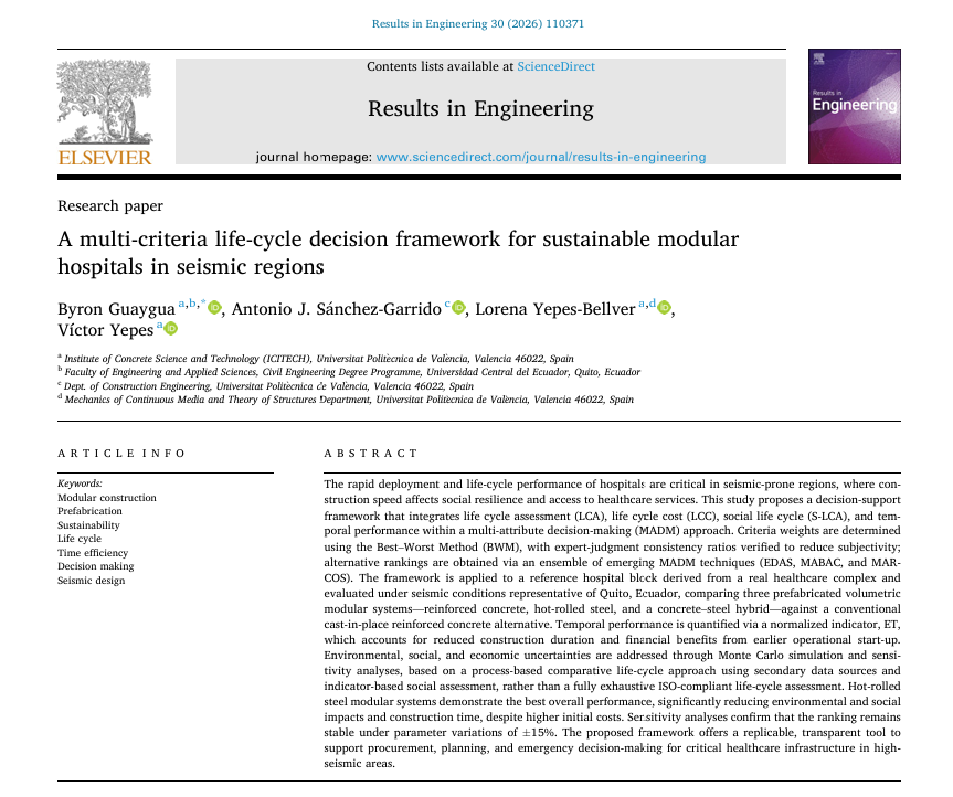 GUAYGUA, B.; SÁNCHEZ-GARRIDO, A.; YEPES-BELLVER, L.; YEPES, V. (2026). A multi-criteria life-cycle decision framework for sustainable modular hospitals in seismic regions. Results in Engineering, 30, 110371. DOI:10.1016/j.rineng.2026.110371