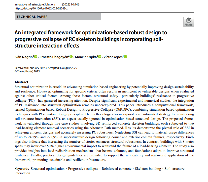 – Optimización paramétrica de muros de contención (Yepes et al., 2008). – Optimización del tamaño y la disposición de las estructuras de acero (Bresolin et al., 2022). – Minimización de costes e impacto ambiental (CO₂) en el hormigón armado (Santoro y Kripka, 2020; Medeiros y Kripka, 2014). – Diseño de estructuras marinas bajo incertidumbre (Toğan, 2012). |