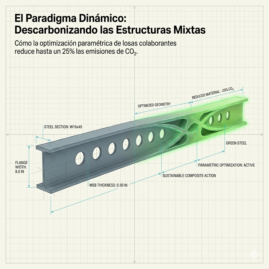La industria de la construcción es una de las principales causantes de la degradación medioambiental, por lo que es necesario transformarla para que adopte prácticas más sostenibles. La optimización estructural surge como una herramienta esencial para este propósito, ya que automatiza el diseño, controla el tipo y la cantidad de material utilizado y fomenta tipologías innovadoras. Aunque la investigación se ha centrado tradicionalmente en la optimización de estructuras convencionales de hormigón armado, existe una necesidad creciente de integrar tipologías compuestas e híbridas en marcos de evaluación del ciclo de vida completo.