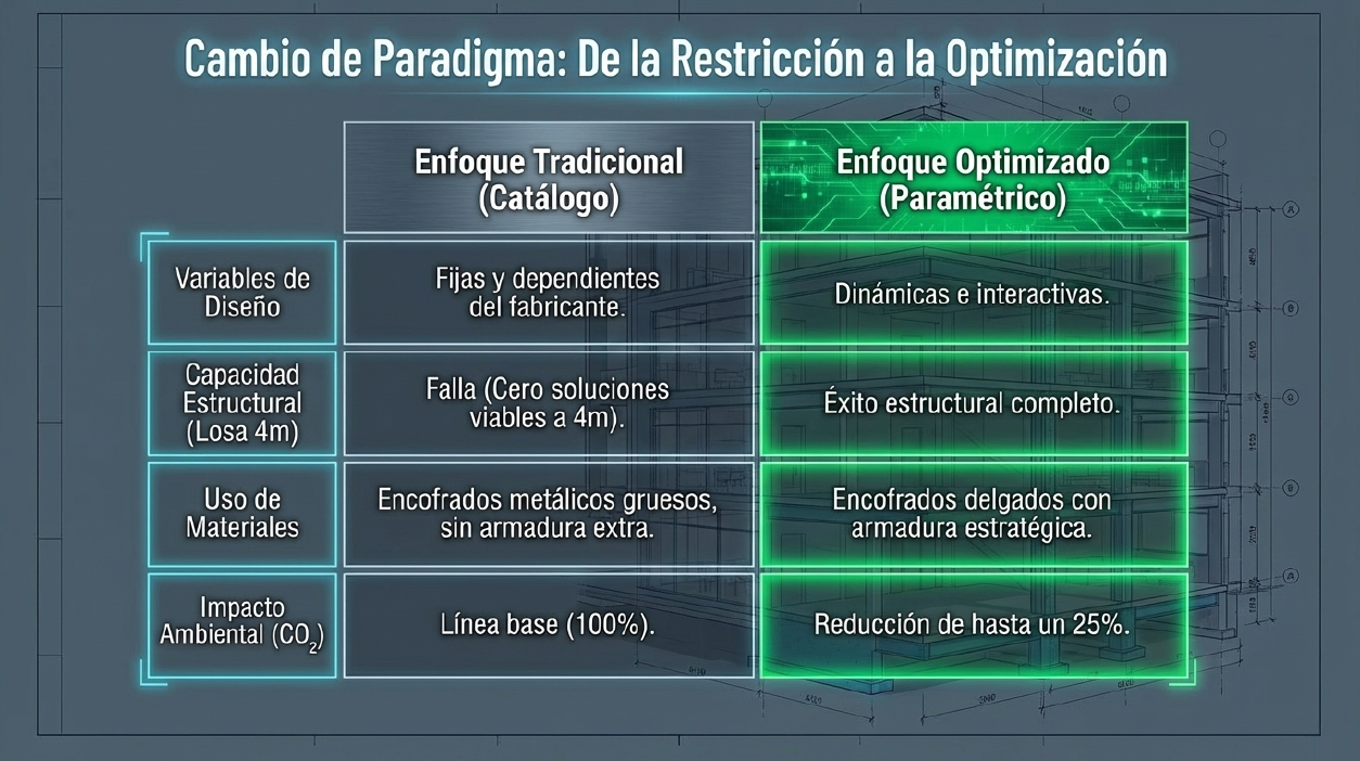 La optimización estructural reduce drásticamente el impacto ambiental en comparación con un enfoque de diseño tradicional.