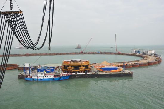 Figura 1. Ataguía celular para la construcción de isla artificial de conexión puente-túnel del Hong Kong-Zhuhai-Macao Bridge. http://www.americanpiledriving.com/wordpress/2011/12/12/