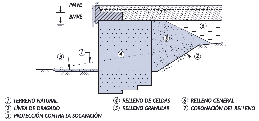 Estos cilindros son relativamente grandes, con diámetros típicos de 12 a 20 m. Se utilizan en la construcción de presas, muelles (Figura 2), pilas de puentes y recintos en general donde debe trabajarse en seco.