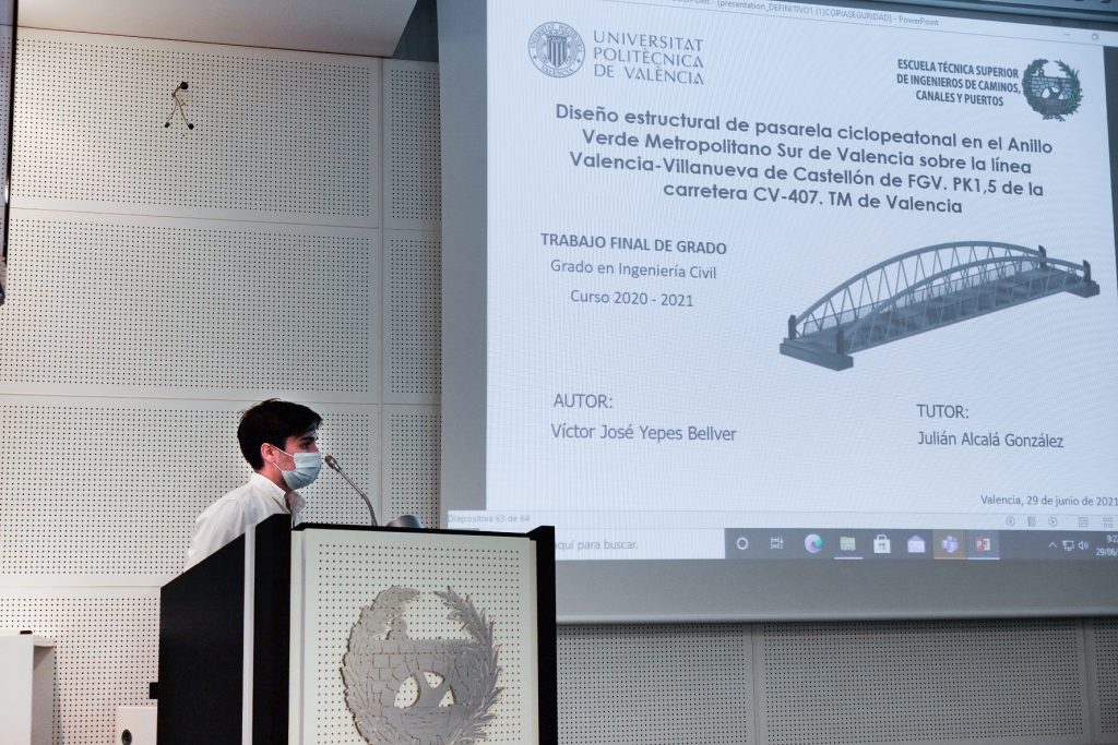 En el día de hoy, 29 de junio de 2021, Víctor José Yepes Bellver ha defendido su Proyecto Final de Grado, de forma presencial, como culminación de sus estudios del Grado en Ingeniería Civil, en la Escuela Técnica Superior en Ingeniería de Caminos, Canales y Puertos de Valencia.
