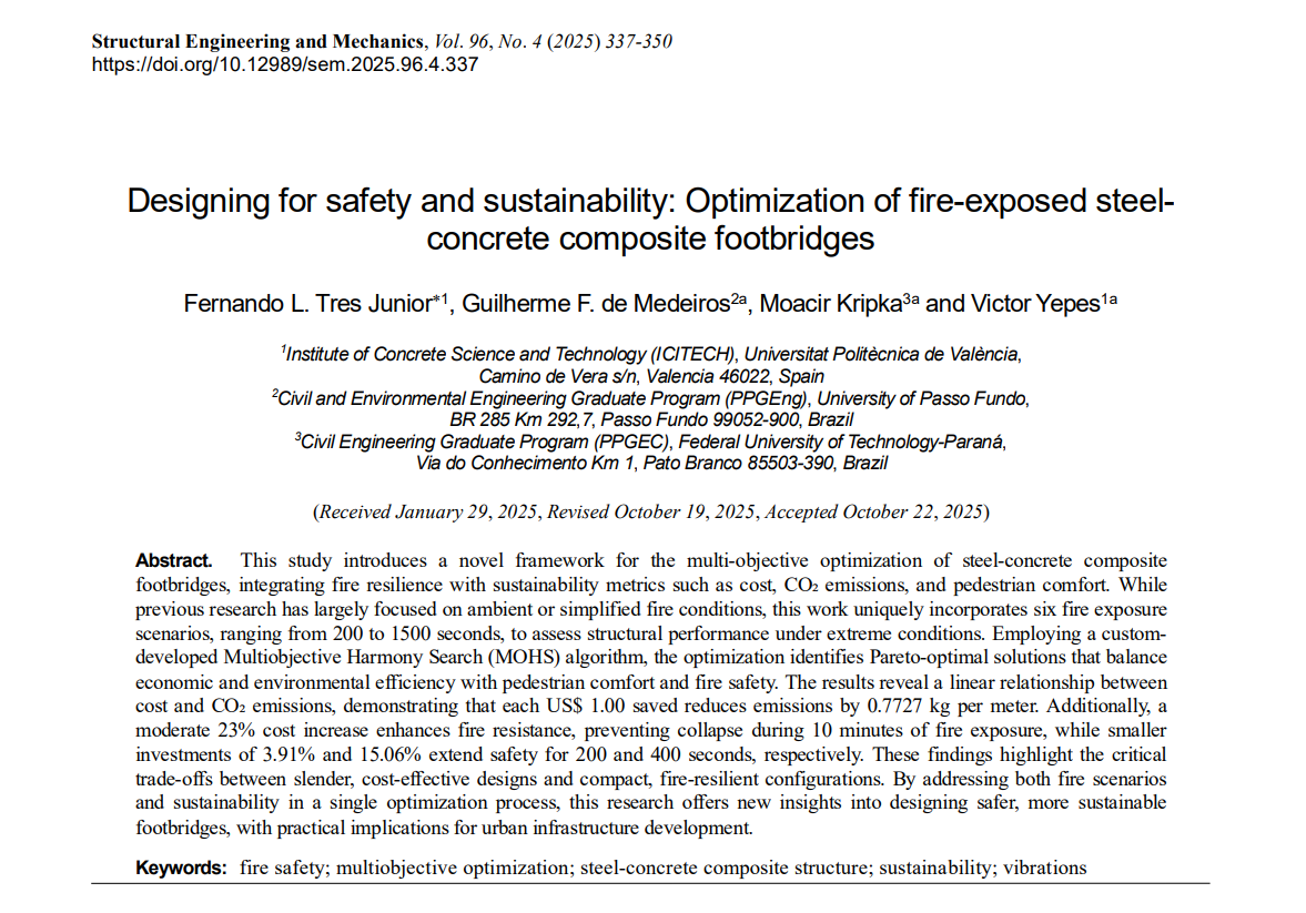 TRES JUNIOR, F.L.; DE MEDEIROS, G.F.; KRIPKA, M.; YEPES, V. (2025). Designing for Safety and Sustainability: Optimization of Fire-Exposed Steel-Concrete Composite Footbridges. Structural Engineering and Mechanics, 96 (4):337-350. DOI:10.12989/sem.2025.96.4.337