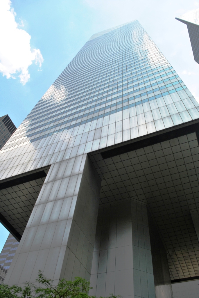 Base del Citigroup Center junto a la Iglesia de San Pedro, lo que obligó a una disposición inusual de las columnas. https://es.wikipedia.org/wiki/Citigroup_Center