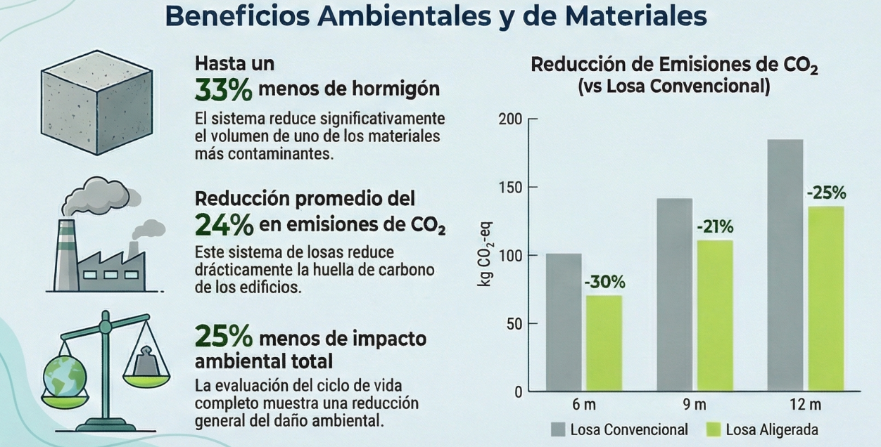• – Reducción del 17 % de las cargas transmitidas a columnas y cimentaciones.