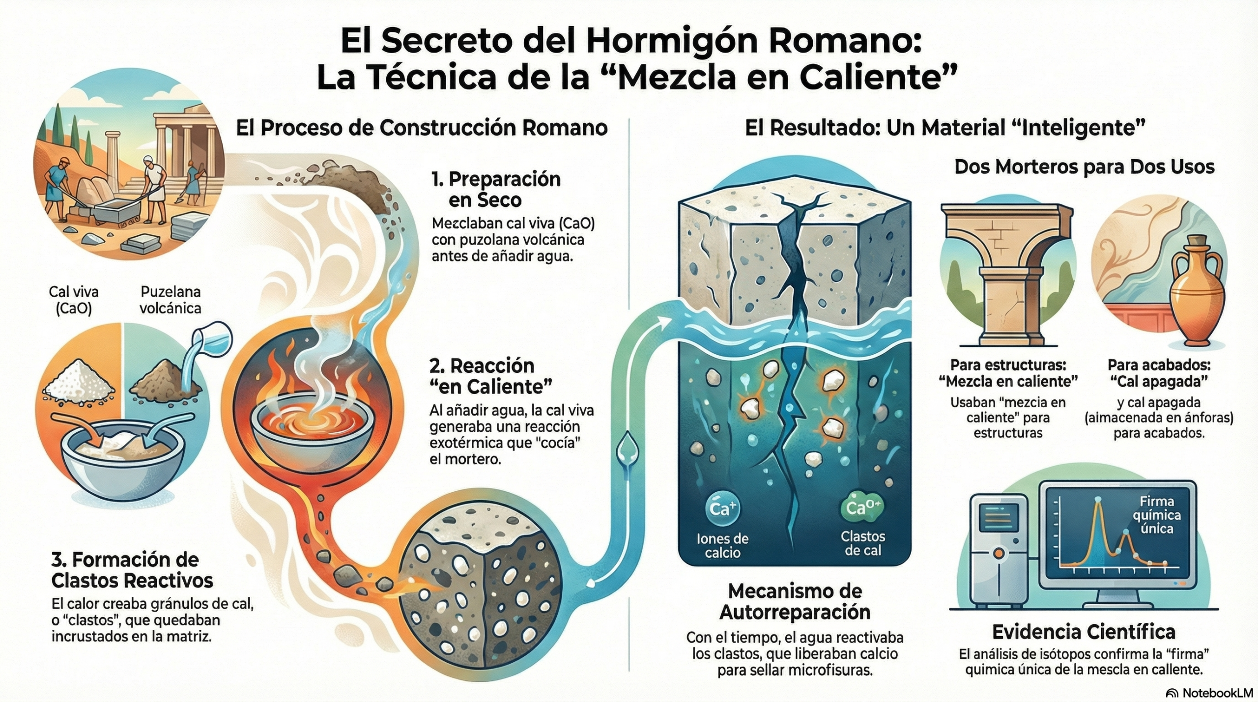 En determinadas obras históricas, la presencia de grumos de cal puede deberse a procesos de mezcla incompletos o a un apagado insuficiente. Sin embargo, en este caso particular, los análisis de espectroscopía infrarroja y de isótopos estables de carbono y oxígeno indican que estos grumos se formaron durante un proceso térmico y químico compatible con la utilización deliberada de cal viva. Los investigadores documentan, además, la segregación intencionada de materiales: montones de premezcla con cal viva para muros estructurales frente a ánforas con cal apagada para acabados. Por tanto, las pruebas apuntan a una técnica constructiva específica (hot mixing) y no a una ejecución negligente.