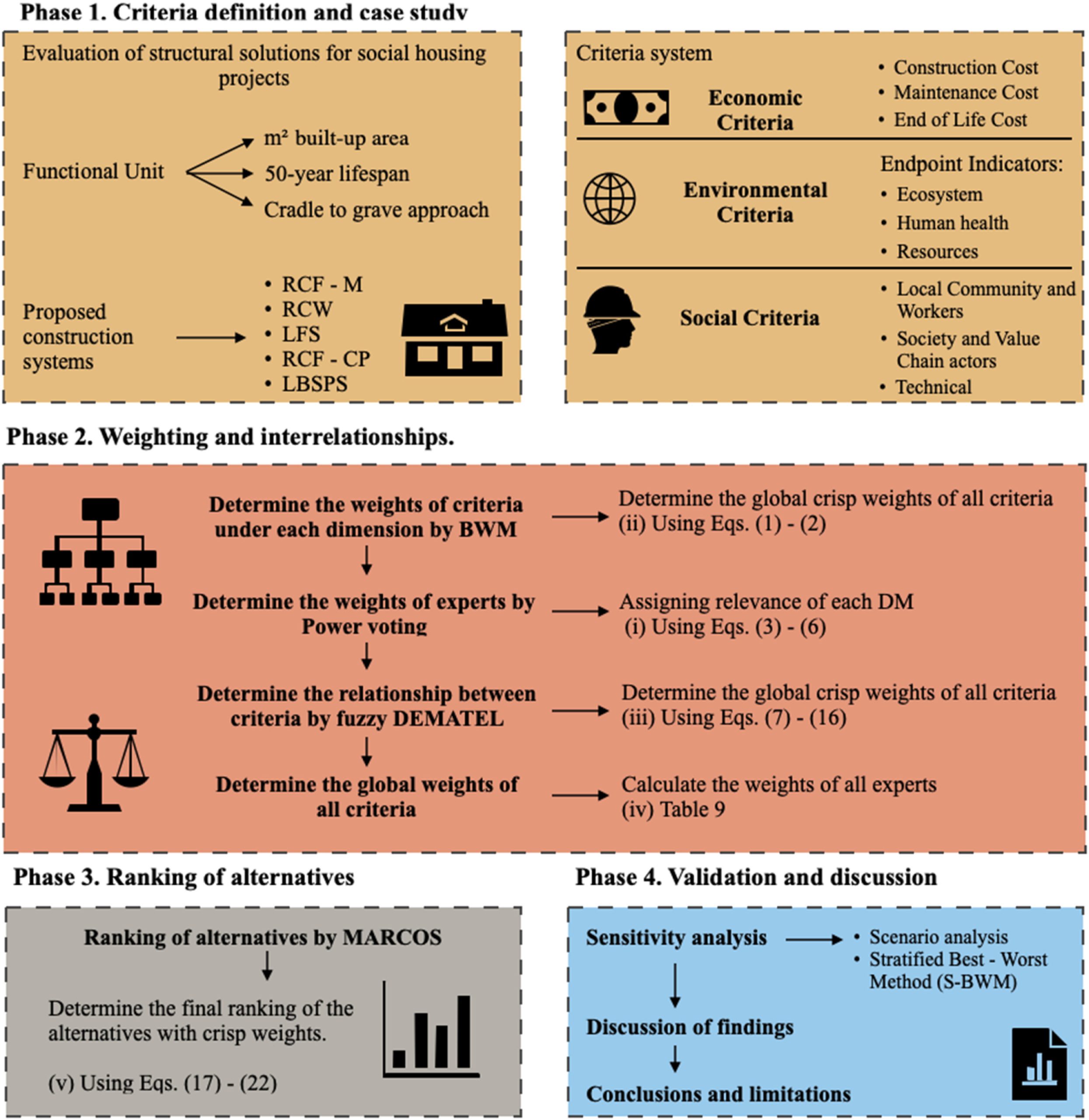 El artículo presenta un marco metodológico integrador que combina evaluaciones basadas en el ciclo de vida —análisis de ciclo de vida (LCA), análisis de coste del ciclo de vida (LCC) y análisis de ciclo de vida estocástico (S-LCA)— con técnicas avanzadas de decisión multicriterio: método mejor-peor (BWM), análisis DEMATEL difuso y análisis MARCOS. Esta integración permite incorporar ponderaciones de expertos, modelar relaciones causales entre criterios y sintetizar resultados frente a soluciones ideales o anti-ideales, lo que aumenta la transparencia en la priorización de alternativas constructivas. Este enfoque se ha aplicado a un caso real de vivienda social en Perú, en el que se han comparado cinco sistemas estructurales representativos: LSF, LBSPS, RCW, RCF-M y RCF-CP. El estudio ha proporcionado pruebas empíricas sobre los costes del ciclo de vida, los impactos ambientales y las prestaciones sociales que respaldan las decisiones de diseño y las políticas.