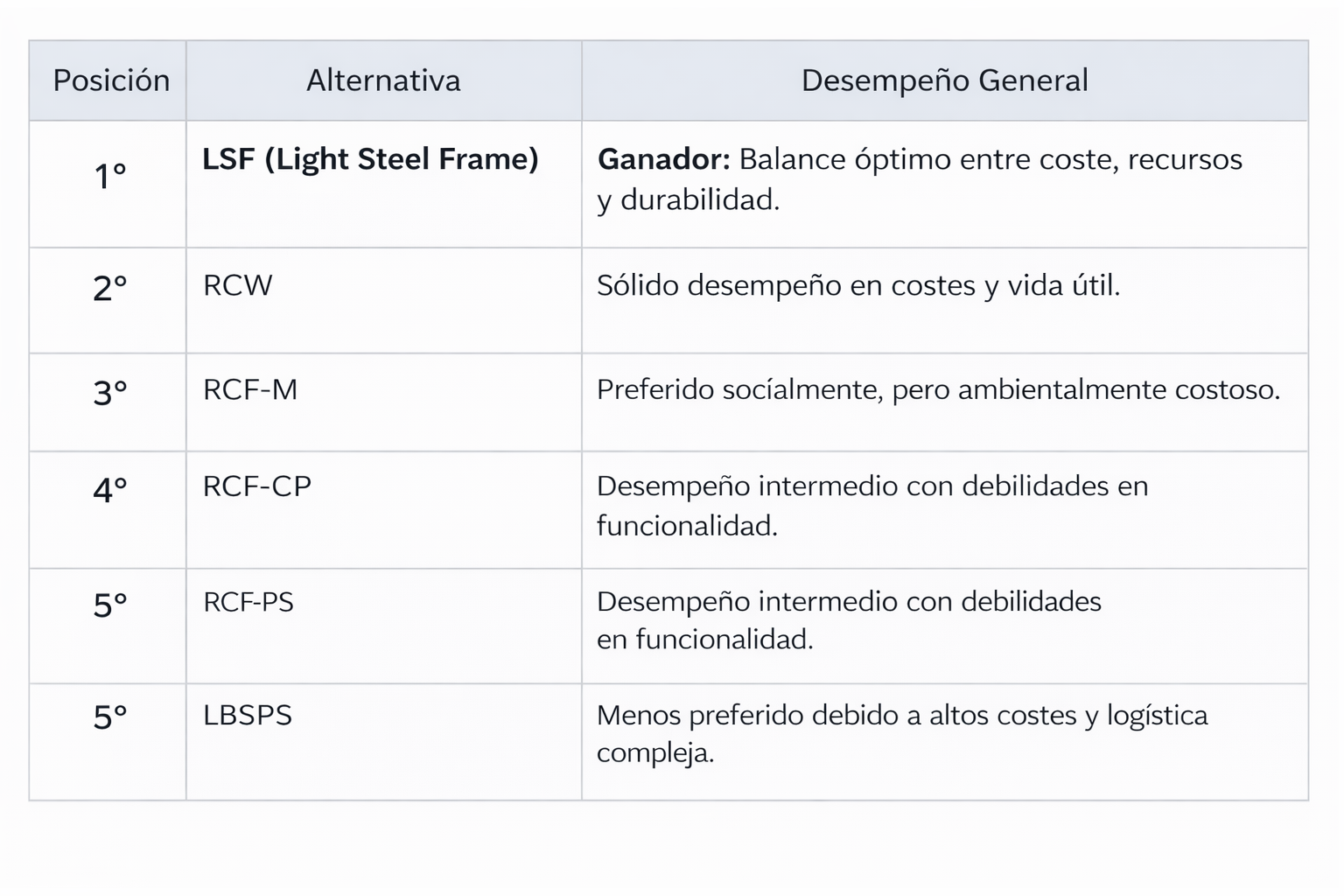 La síntesis mediante MARCOS ubica a LSF como la alternativa mejor valorada en el escenario analizado, seguida de RCW y RCF-M. Los sistemas LBSPS y RCF-CP quedan en posiciones inferiores. Las pruebas de sensibilidad (variación de los pesos de ±15 %, escenarios de distancia de transporte y estratificación de expertos) muestran que el orden general se mantiene, lo que indica cierta robustez frente a perturbaciones razonables en los supuestos. Estos resultados permiten extraer una conclusión práctica: en contextos con características similares a las del caso estudiado, las soluciones ligeras industrializadas pueden mejorar la relación entre coste, impacto ambiental y rendimiento técnico, siempre que se gestionen adecuadamente los aspectos sociales y de ejecución.