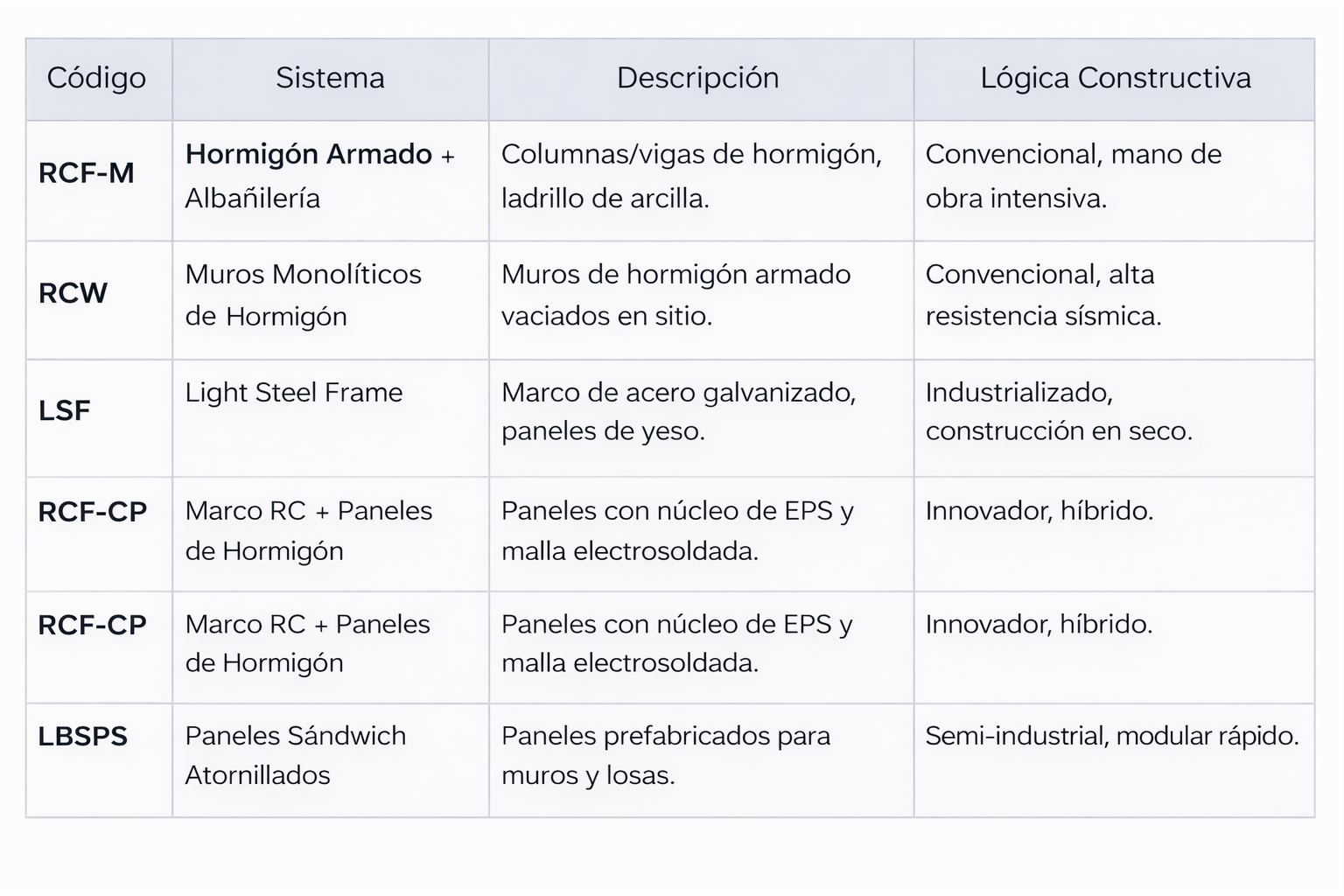 El estudio analiza cinco sistemas constructivos adaptados a contextos de urbanización rápida (específicamente en Lima, Perú), que van desde métodos convencionales hasta industrializados: