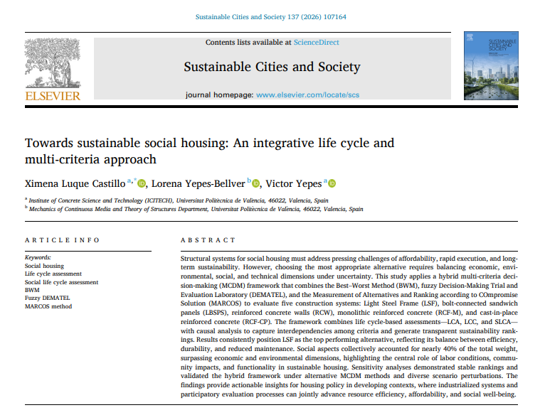 LUQUE CASTILLO, X.; YEPES-BELLVER, L.; YEPES, V. (2026). Towards Sustainable Social Housing: An Integrative Life Cycle and Multi-Criteria ApproachSustainable Cities and Society, 137, 107164. DOI:10.1016/j.scs.2026.107164