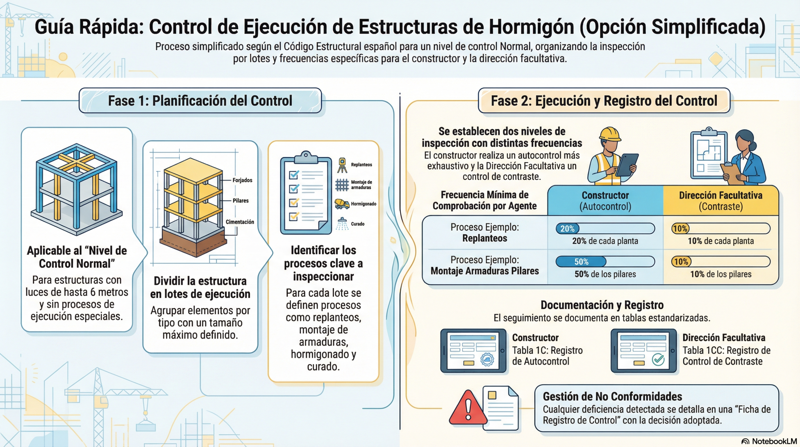 Para comprender la rigurosidad de este sistema, veamos las frecuencias mínimas de inspección de un elemento como el pilar. Según las tablas de inspección del código, el constructor debe comprobar el 50 % de los pilares de un lote, mientras que la dirección facultativa debe realizar un control de contraste del 10 % de dichos pilares. Esta redundancia no es burocracia, sino una red de seguridad diseñada para que nada importante pase desapercibido. Esta redundancia deliberada no solo sirve para detectar errores, sino que forma parte de una filosofía pragmática que reconoce que, en proyectos de esta complejidad, la perfección es imposible, pero garantizar la corrección es posible.