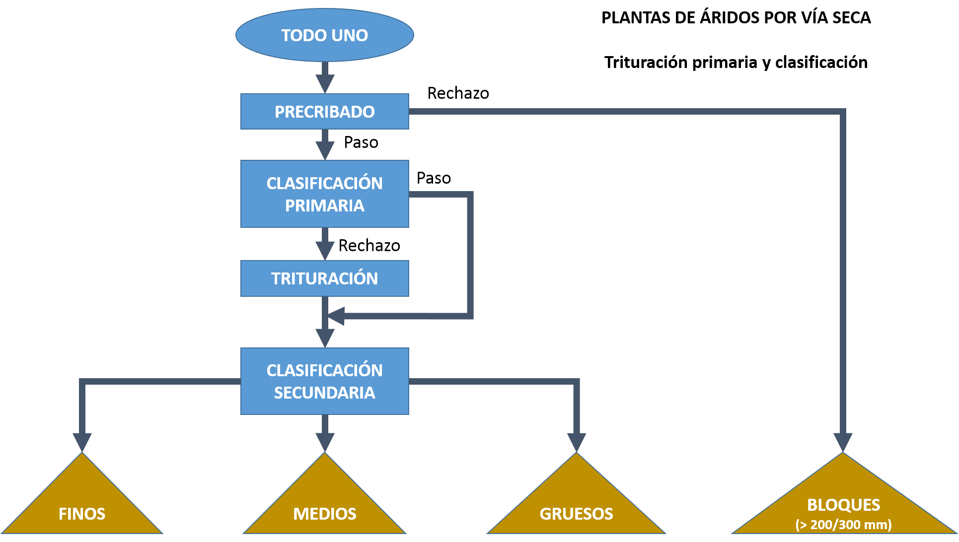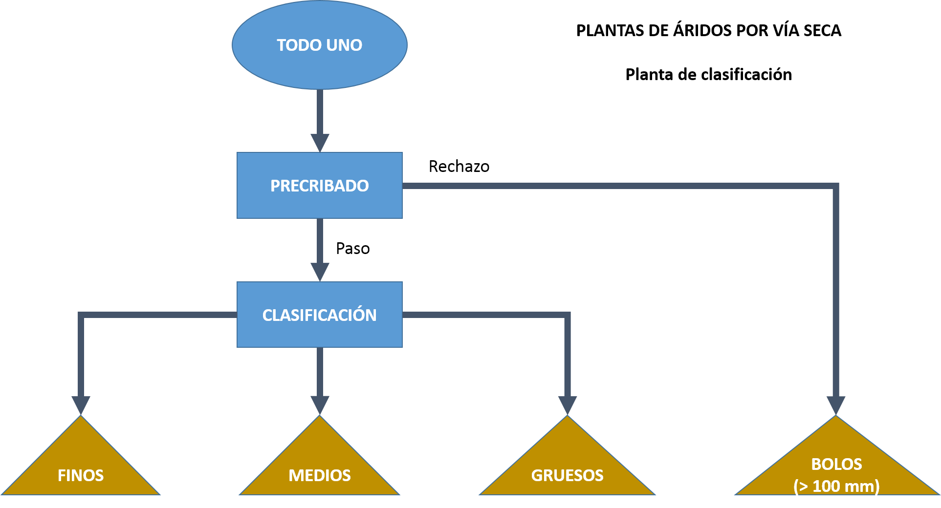 Este tipo de planta se utiliza fundamentalmente para producir áridos para hormigones de obra, zahorras para subbases de carreteras y gravas para rellenos. Se alimenta con materiales procedentes de canteras que contienen una baja proporción de arcilla y material suelto. Los materiales de mayor tamaño (mayores de 100 mm) generalmente se descartan como estériles. Las Figuras 2 y 3 muestran los correspondientes esquemas y diagramas de flujo.