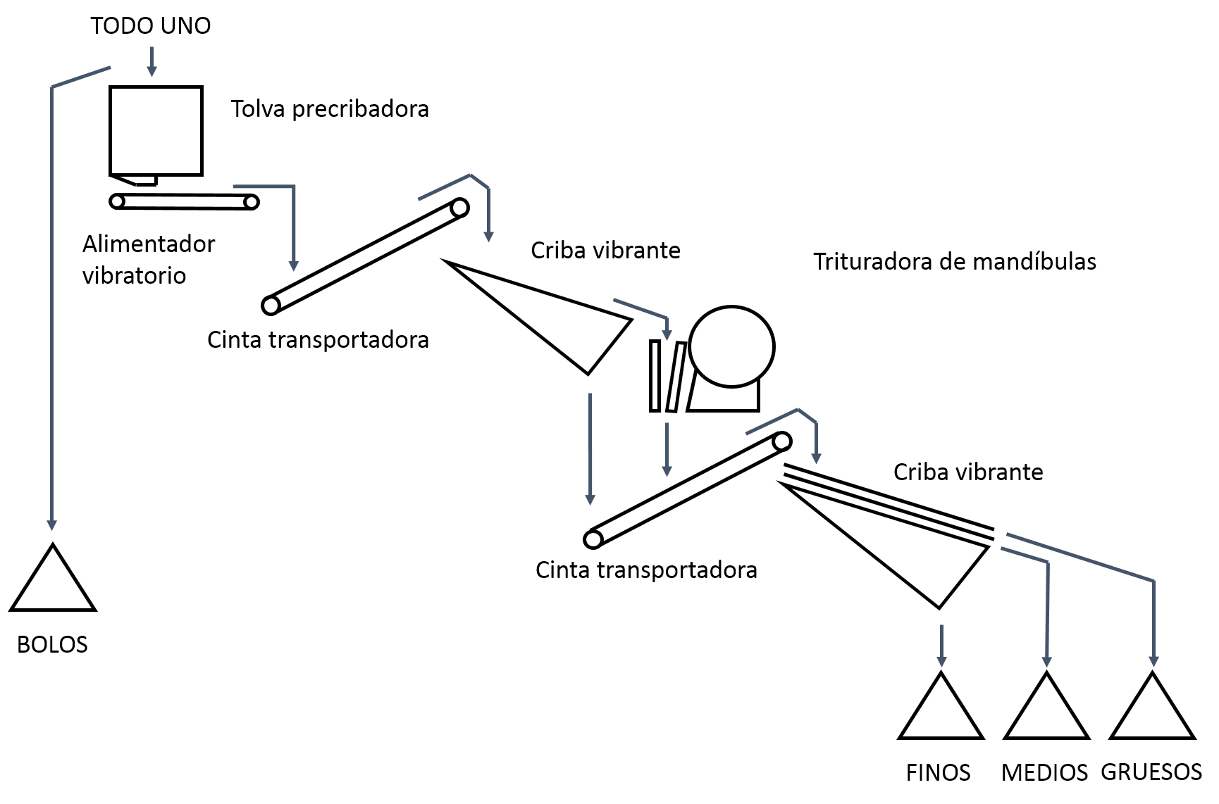 Figura 4. Esquema de una planta de trituración primaria y clasificación en seco (circuito abierto). Elaboración propia, basado en Vázquez García (1998).