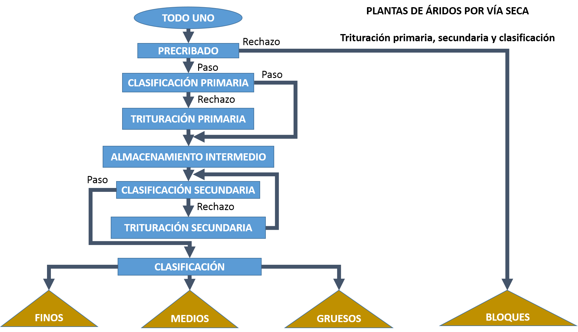En este tipo de plantas se pueden distinguir tres procesos básicos: trituración, clasificación y otras operaciones auxiliares, como la alimentación, el transporte y el almacenamiento.