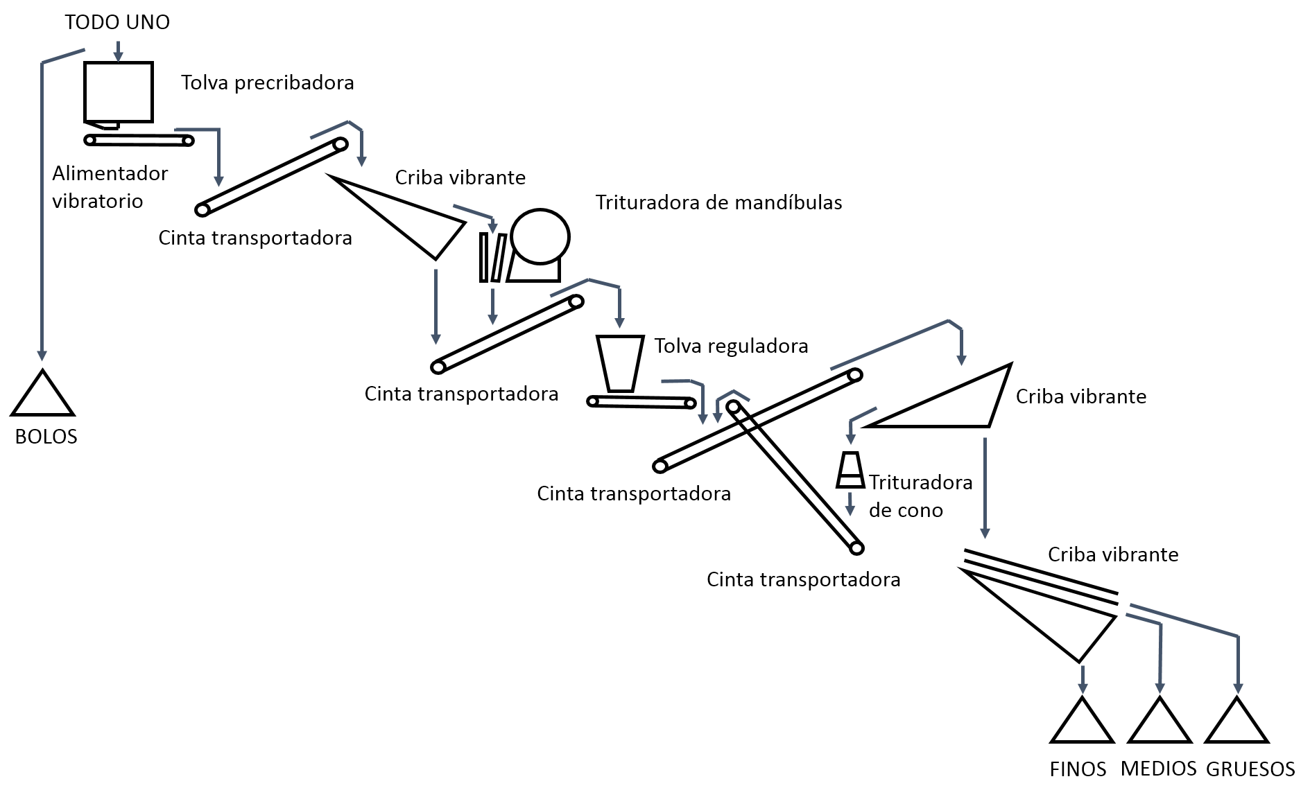 Figura 5. Esquema de flujos de una planta de trituración primaria y clasificación en seco (circuito abierto). Elaboración propia, basado en Vázquez García (1998).