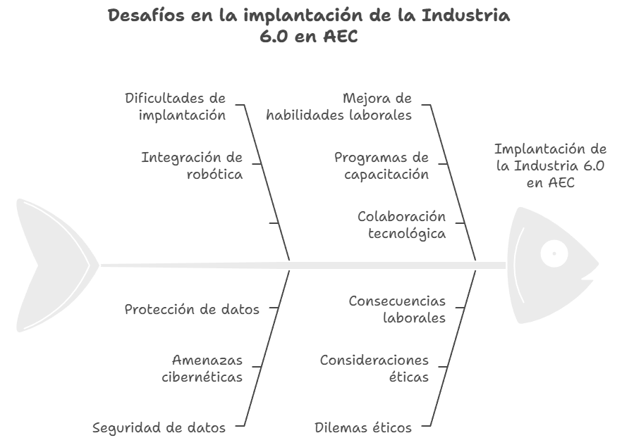 - Dificultades de implantación: A pesar de las ventajas de la Industria 5.0 de la AEC, como el aumento de la participación de las partes interesadas, la automatización, la optimización mediante robótica, las estructuras de decisión basadas en datos y la gestión meticulosa de los recursos, la implementación de los principios de la Industria 6.0 de la AEC presenta dificultades.