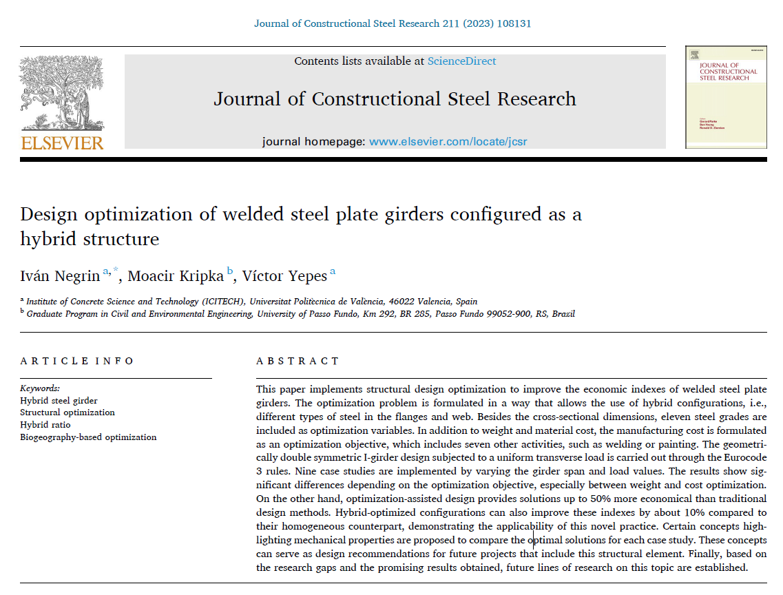 Acabamos de publicar un artículo en la revista indexada JCR The International Journal of Advanced Manufacturing Technology (2025), que presenta una metodología de optimización metaheurística para minimizar el coste de fabricación de las vigas I de placa de acero soldada. El estudio se centra en el desarrollo de tipologías más eficientes, como las vigas híbridas transversales de sección variable (THVS), que optimizan simultáneamente la geometría y la distribución del material en los planos transversal y longitudinal. La función objetivo tiene en cuenta no solo el coste de los materiales, sino también siete actividades clave de producción (soldadura, corte, pintura, etc.) y los diseños cumplen las especificaciones del Eurocódigo 3. Los principales resultados indican que la optimización del material es más importante para las vigas de tramos cortos, mientras que la optimización geométrica lo es más para las vigas de tramos largos. En última instancia, el artículo valida el enfoque propuesto mediante un caso de estudio, que demuestra que los elementos THVS pueden reducir los costes hasta en un 70 % en comparación con los diseños tradicionales.