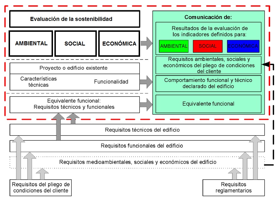 Por otra parte, la satisfacción de los requisitos técnicos y funcionales establecidos en el pliego de condiciones del cliente o bien en las especificaciones del proyecto, generan impactos y aspectos ambientales, sociales y económicos, que pueden ser positivos o negativos, y que pueden persistir durante el ciclo de vida completo del edificio, incluso pudiendo continuar después del desmantelamiento y la demolición.