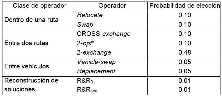 Como técnica de búsqueda local se ha empleado la metaheurística propuesta por Yepes y Medina (2006) para el problema VRPHESTW, de búsqueda por entornos variables basada en la elección probabilística de 9 operadores distintos y un criterio de aceptación por máximo gradiente. Los movimientos elegidos han sido los siguientes: