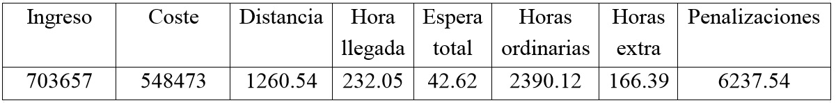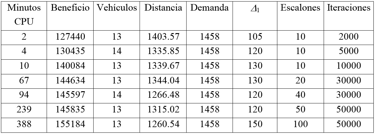 El mejor resultado obtenido por esta metaheurística (ver Tabla 3) es inferior al encontrado por el algoritmo del solterón propuesto por Yepes y Medina (2004) para un tiempo de cálculo similar. En aquella ocasión se obtuvo un beneficio de 170335, con 13 vehículos que recorrieron un total de 1229.13 unidades de distancia. Esta circunstancia sugiere que la búsqueda local de máximo gradiente empleada podría sustituirse por un algoritmo de búsqueda más agresiva, como el algoritmo del solterón.