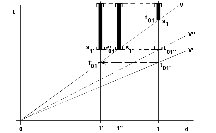 En efecto, un vehículo con una velocidad v llega de 0 a 1 en el instante t01 (ver Figura 1). Se supone, sin perder generalidad, que el tiempo de servicio es nulo. Si la velocidad se incrementase a v’, entonces la llegada ocurriría en t01’. Esta situación equivale a suponer que el nodo, en vez de estar en 1 está más cerca de 0, es decir, en 1’ y la velocidad se mantiene en v. Así, la llegada ocurre en el instante t’01, que es igual al t01’. Por tanto, un aumento en la rapidez de los vehículos es equivalente a un acortamiento físico de las distancias. Sin embargo, las ventanas temporales interfieren en el razonamiento anterior. La existencia de esperas provoca que, aunque la velocidad v’ favorece el acortamiento a la distancia 1’, no es posible iniciar el servicio puesto que lo impide la ventana temporal. La situación equivalente es la representada en la Figura 1 cuando el vehículo circula a una velocidad v’’. En este caso, el acortamiento de distancias a 1’ se ve interrumpido por la limitación en el inicio del servicio a la situación 1’’, donde el inicio del servicio s1’ es coincidente con el s1’’. La conclusión es que el aumento de la rapidez de los vehículos permite relajar las restricciones en las distancias, acortando éstas mientras las limitaciones horarias no lo impidan.