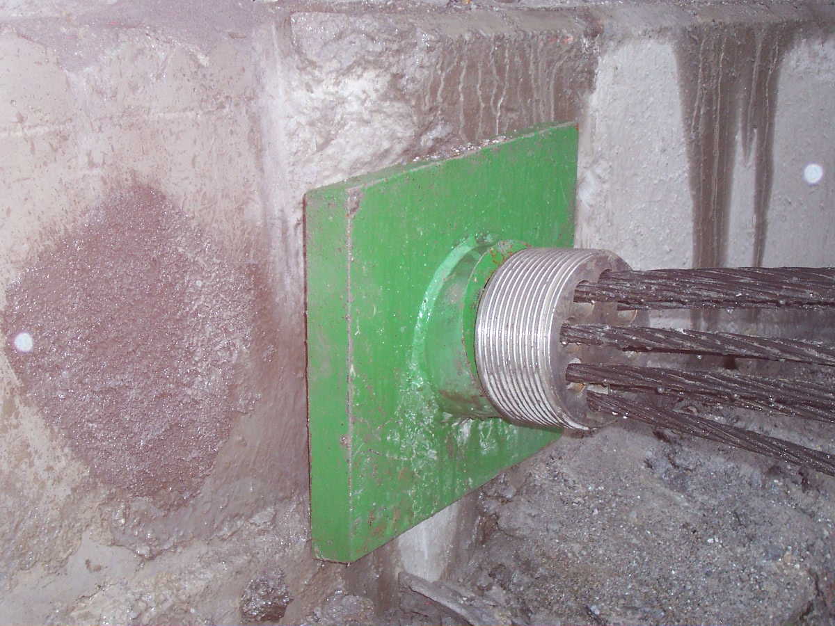 - Cabeza y placa de apoyo: Elementos del anclaje que lo fijan a la estructura y mediante cuñas inmovilizan los torones.