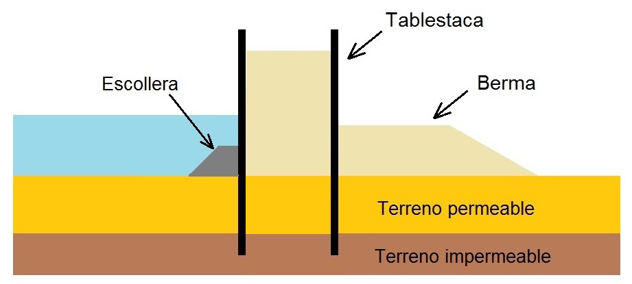 Aún se podría minimizar el espacio ocupado si utilizamos dos cortinas de tablestacas y entre ellas construimos un macizo de tierras que de estabilidad al conjunto, y que mejore la estanqueidad de las cortinas si el material es arcilloso (Figura 5). En este caso, también se dispone escollera aguas arriba y una berma de tierras aguas abajo.