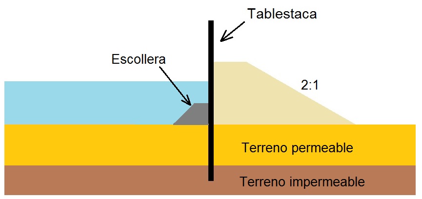 Puede reducirse el espacio ocupado por la ataguía si se respalda la ataguía con un macizo de tierras aguas abajo, siempre y cuando las tablestacas presenten resistencia suficiente a los empujes (Figura 4). En este caso, es conveniente evitar las socavaciones de las tablestacas disponiendo escollera a su pie, aguas arriba.