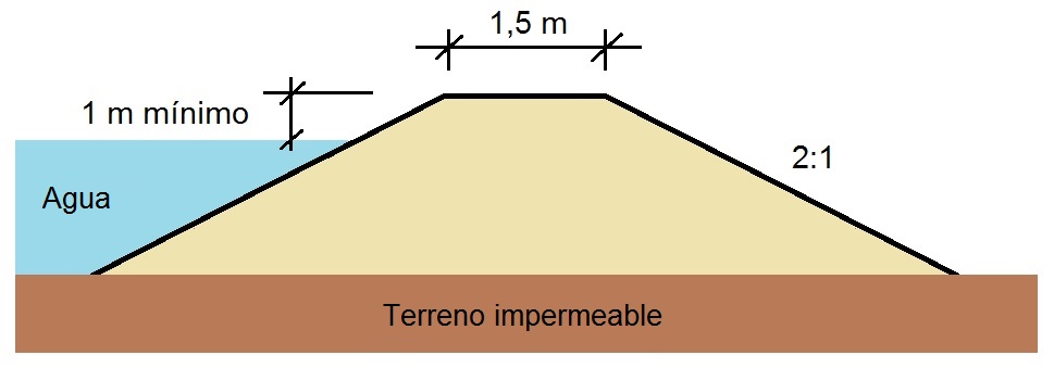 Se suelen usar taludes de 3/2 en el paramento de aguas arriba y de 2/1 en el de aguas abajo, con un ancho de coronación de al menos 1,50 m (Figura 2). Se preverá también una altura mínima de 1 m sobre las crecidas normales. Si el talud de la ataguía se somete a un flujo hidráulico, se debe proteger mediante un pedraplén o cualquier otro procedimiento que impida la socavación; pero en este caso hay que sopesar el coste económico de este recubrimiento frente a otros procedimientos constructivos.