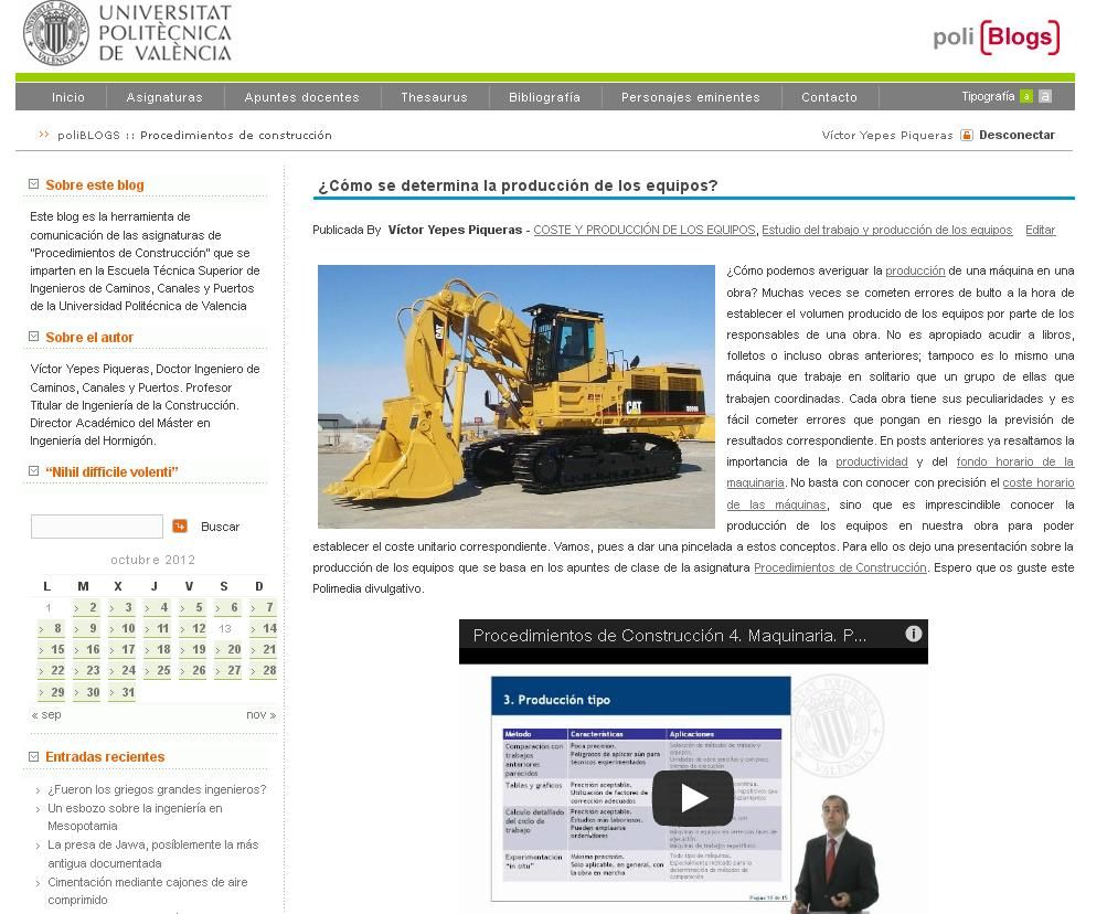 La fecha de nacimiento del blog (http://procedimientosconstruccion.blogs.upv.es/) es el 15 de septiembre de 2012, es decir, se inicia con el comienzo del curso académico 2012-2013. Una de las necesidades que pretendía cubrir el blog era la de organizar toda la información adicional que, de forma habitual se venía utilizando en clase, pero que se encontraba dispersa y poco accesible al alumno. Así por ejemplo, a veces se recogían noticias de prensa, fotografías o vídeos sobre maquinaria y técnicas constructivas que, de un curso para otro, en ocasiones se perdía o no podía recuperarse por parte del alumno como material para otras asignaturas. Sobre estos post los alumnos realizan tareas complementarias y grupales, de forma que el blog se convierte en una herramienta viva, cuyos contenidos se actualizan y amplían constantemente. Además, pretende de servir de referencia a los alumnos en su futuro académico y profesional. Un aspecto interesante es la posibilidad que brinda el blog de insertar objetos docentes (vídeos educativos o laboratorios virtuales) procedentes del programa Docencia en Red de la Universitat Politècnica de València, así como su vinculación a la página de la asignatura alojada en la plataforma Poliformat.
