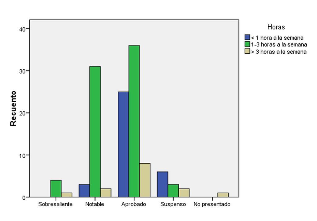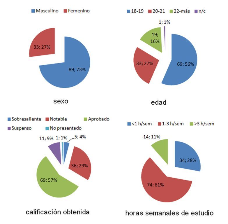 También se preguntó sobre la nota obtenida en la asignatura: 5 alumnos con sobresaliente (4,10%), 36 con notable (29,51%), 69 aprobados (56,55%), 11 suspensos (9,02%) y un alumno no presentado (0,82%). En cuanto a las horas de estudio, 34 alumnos (27,87%) manifestaron que estudiaban menos de 1 hora a la semana, 74 (60,66%) dedicaban entre una y tres horas y 14 alumnos (11,47%) más de tres semanales. En la Figura 2 se ha representado la caracterización de la muestra analizada.