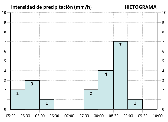 Hietograma: Es un gráfico que representa la intensidad de la precipitación en un intervalo de tiempo determinado. A diferencia del pluviograma, el hietograma se centra en la tasa de precipitación (en mm/h). Esta información es crucial en ingeniería para analizar eventos de precipitación intensos y de corta duración, como las tormentas, que pueden provocar inundaciones y desbordamientos.