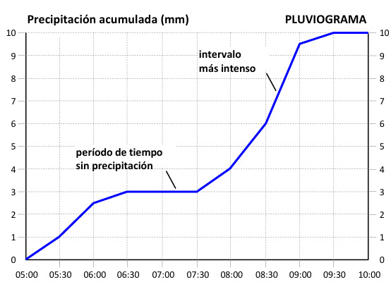 Pluviograma: Es un gráfico que muestra la acumulación de precipitaciones en función del tiempo. El eje vertical representa la altura de la precipitación acumulada, mientras que el eje horizontal muestra el tiempo. Esto permite visualizar cómo se acumula la lluvia durante un evento específico, como una tormenta.