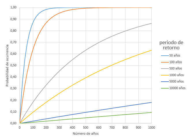 Nota importante: Una infraestructura no falla exactamente a los 100 años si está diseñada para un periodo de retorno de 100 años. De hecho, su probabilidad es del 63 %. Incluso existe una probabilidad del 10 % de que falle a los 10 años de su construcción. Que te toque la lotería de Navidad tiene una probabilidad del 0,001 %, pero de hecho, hay gente a la que le ha tocado la lotería varias veces seguidas. Por tanto, hay que ser cautos con la estadística.