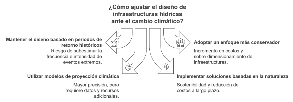 Adaptar las infraestructuras al cambio climático implica revisar los periodos de retorno y los valores de las curvas IDF para considerar eventos más intensos o frecuentes. En este contexto, es fundamental contar con bases de datos a largo plazo y modelos predictivos que permitan simular condiciones futuras.