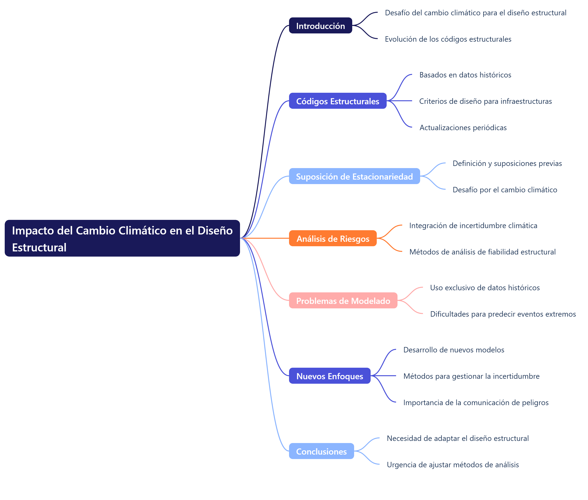En resumen, los códigos estructurales establecen los criterios necesarios para diseñar infraestructuras capaces de resistir eventos climáticos como tormentas, nieve e inundaciones, y se actualizan periódicamente para reflejar los avances científicos y tecnológicos. Sin embargo, el cambio climático plantea un reto significativo, ya que altera las condiciones climáticas de manera impredecible, lo que hace que la suposición de estacionariedad que hasta ahora ha guiado el diseño estructural sea obsoleta. Este artículo explora cómo los códigos estructurales han evolucionado hacia un diseño basado en estados límite y la necesidad urgente de ajustar los métodos de análisis de riesgos ante la creciente incertidumbre climática. Además, se analizan los problemas derivados del uso exclusivo de datos históricos para modelar cargas climáticas y las dificultades que plantea el cambio climático a la hora de predecir eventos extremos. Finalmente, se destaca la necesidad de desarrollar nuevos modelos y enfoques analíticos que garanticen la seguridad de las infraestructuras en un entorno climático en constante cambio.