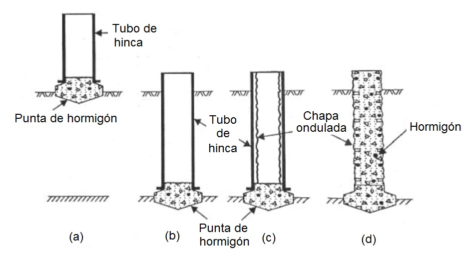 Este pilote, llamado pilote Western «de fondo de botón», emplea un tubo metálico de unos 30-35 cm de diámetro que se hinca en el terreno hasta el rechazo. En el extremo del tubo hay una punta de hormigón prefabricado (button) de unos 45 cm de diámetro, algo mayor que queda perdida. La forma y la resistencia de esta punta permiten atravesar estratos de gran resistencia. Una vez alcanzado el nivel previsto, se introduce en el tubo una chapa ondulada que se une con el fondo. Esta chapa se queda en el terreno y tiene como misión proteger el hormigón. Una vez fijada la chapa ondulada, se vierte el hormigón en su interior, pudiendo disponerse o no de armadura, y después se extrae el tubo que ha servido de hinca. Esta chapa corrugada favorecería inicialmente la resistencia del fuste del pilote; sin embargo, el hueco que se forma alrededor de la misma cuando se recupera el tubo de hinca no favorece el rozamiento, por lo que es mejor considerar que trabaja por punta. Su longitud alcanza unos 20-30 m y soporta cargas de unos 500 kN o mayores. Este tipo de pilote es patentado por Western.