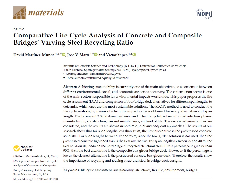 MARTÍNEZ-MUÑOZ, D.; MARTÍ, J.V.; YEPES, V. (2021). Comparative life cycle analysis of concrete and composite bridges varying steel recycling ratio. Materials, 14(15):4218. DOI:10.3390/ma14154218