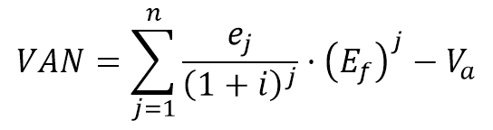 Si denominamos ej los ingresos netos en el año j, n el número de periodos, e i la tasa de actualización o coste del capital, g a la tasa de inflación y f al tanto por uno en que cada año incrementa el valor nominal de los flujos netos de caja a consecuencia de la inflación, el valor actual neto (VAN) se puede calcular de la siguiente forma: