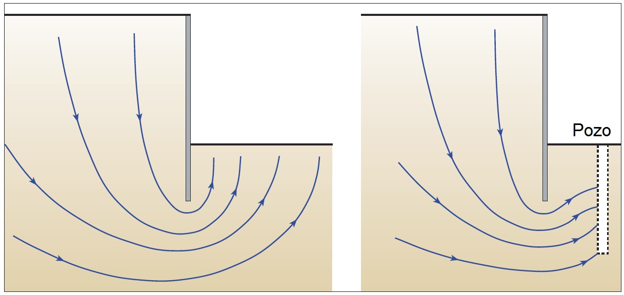 | Gravas / cantos | Alta | Se requieren grandes flujos de agua que pueden provenir de pozos profundos para excavaciones profundas o de sumideros para excavaciones superficiales. | Pozos de bombeo profundo y de bombeo desde sumideros. |