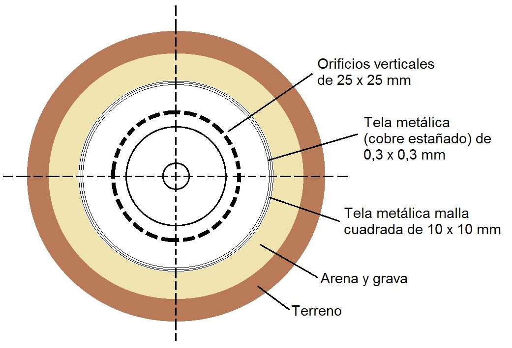 - Filtro: El sumidero debe estar protegido con una tubería ranurada o perforada, rodeada de grava gruesa (20-40 mm) para evitar la succión de partículas finas del suelo.