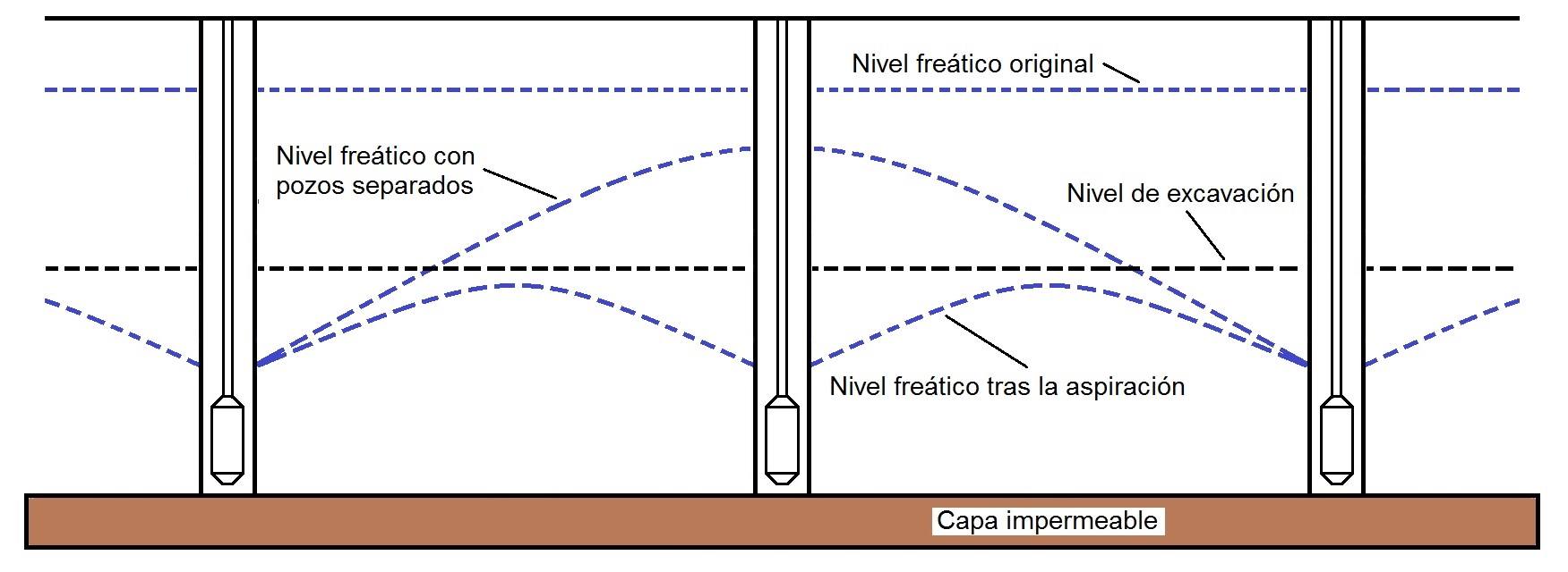 - Control del radio de influencia: diseñar el sistema para limitar la bajada del nivel freático más allá de los límites de la zona, utilizando, si es necesario, barreras de corte o pozos de reinyección.