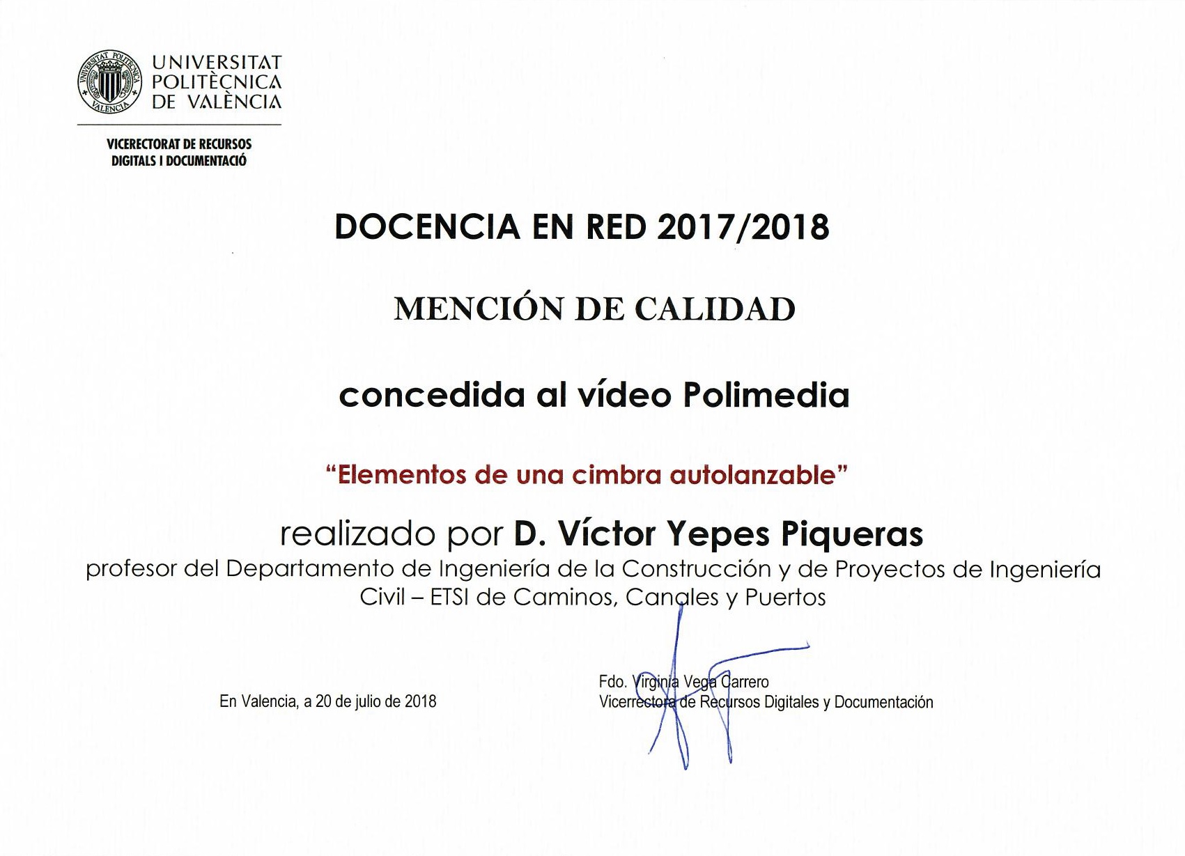 En el ámbito docente, me gustaría destacar el Curso de Creatividad que impartí en marzo de este año en la universidad de La Rioja a personal docente y el Curso de Planificación y Gestión de Playas que impartí y dirigí en la Universidad de Oporto en junio. Pero, quizás sin duda, uno de los hitos de este año fue la puesta en marcha, por primera vez, de un curso MOOC (gratuito, masivo y online) denominado «Introducción a los encofrados y las cimbras en obra civil y edificación«, que este mismo año ya va por la tercera edición y ha tenido casi 4000 alumnos inscritos. Todo un éxito inesperado que espero poder repetir en un futuro próximo con otros temas. En cuanto a premios recibidos, destaco el Premio Docencia en Red 2017/2018, recibido en el contexto del Plan de Docencia en Red de la Universitat Politècnica de València por la elaboración de material educativo en formato digital.