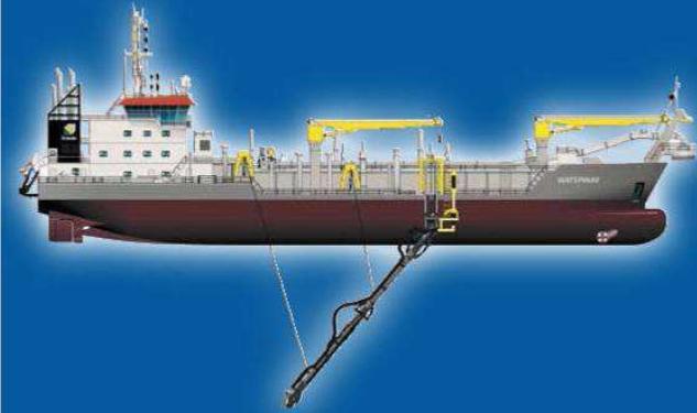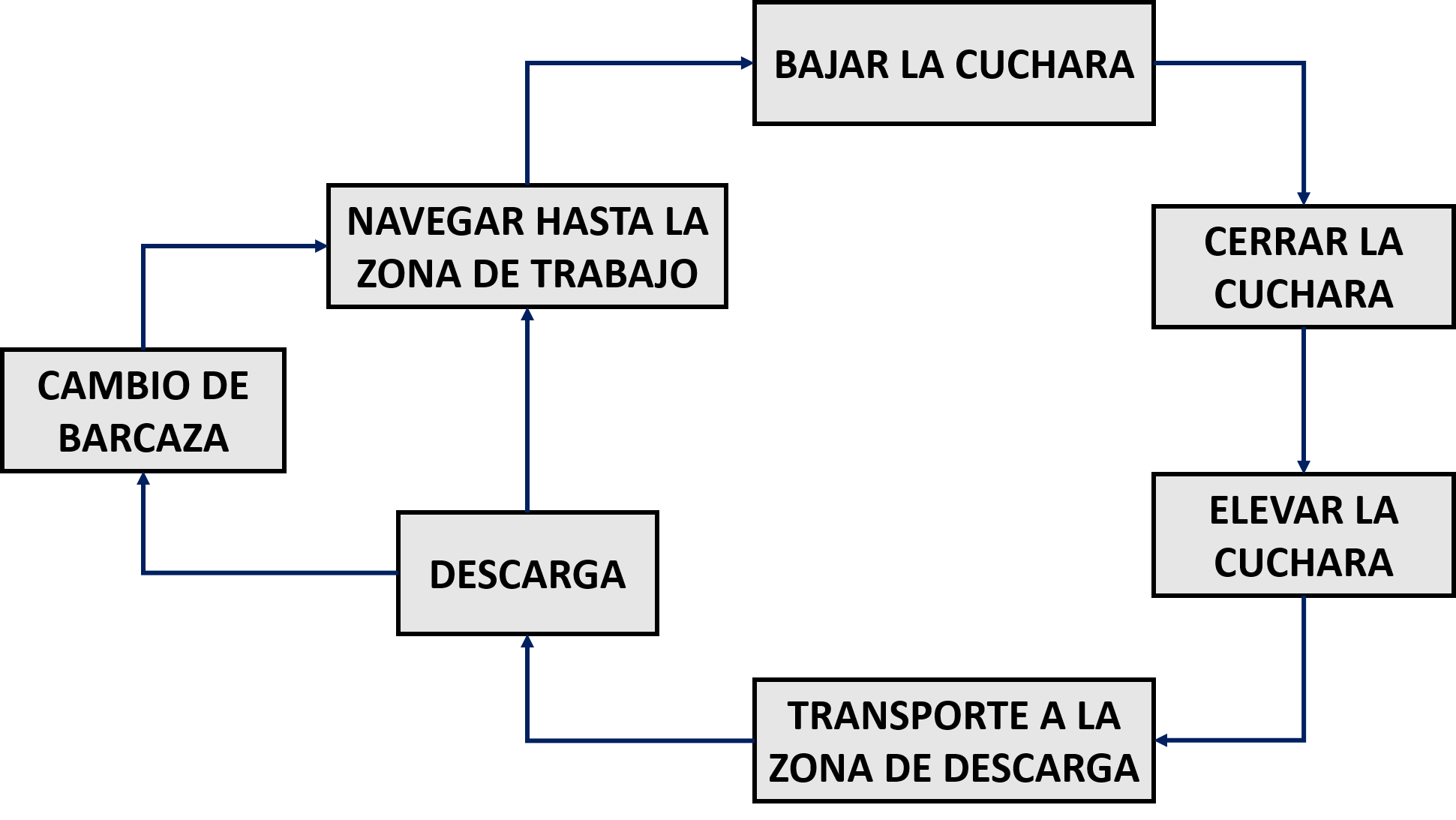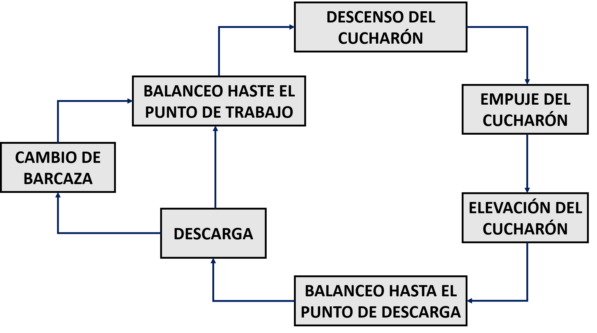 - Izado de los 2 spuds situados en el tercio delantero. El spud de popa hace girar a la draga sobre su eje (eje motor). Reinicio del proceso.