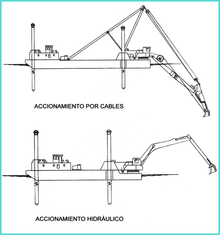 La cuchara de la retroexcavadora tiene una cara cóncava orientada hacia atrás, lo que permite que el cucharón se acerque a la plataforma durante la excavación. La cuchara entra en la capa de material que se va a extraer de arriba hacia abajo. Este método de trabajo es similar al de las dragas de pala frontal al excavar coronas circulares. Sin embargo, estos equipos pueden operar tanto en avance como en retroceso, lo que reduce los derrames y garantiza un fondo dragado de mejor calidad. La capacidad de trabajar en ambas direcciones mejora el rendimiento en la extracción de materiales compactos o rocas rotas. Las dragas retroexcavadoras con cables son muy efectivas en el dragado de arcillas cohesivas, pues se pueden instalar empujadores en la parte inferior del brazo de excavación que facilitan la descarga del material.