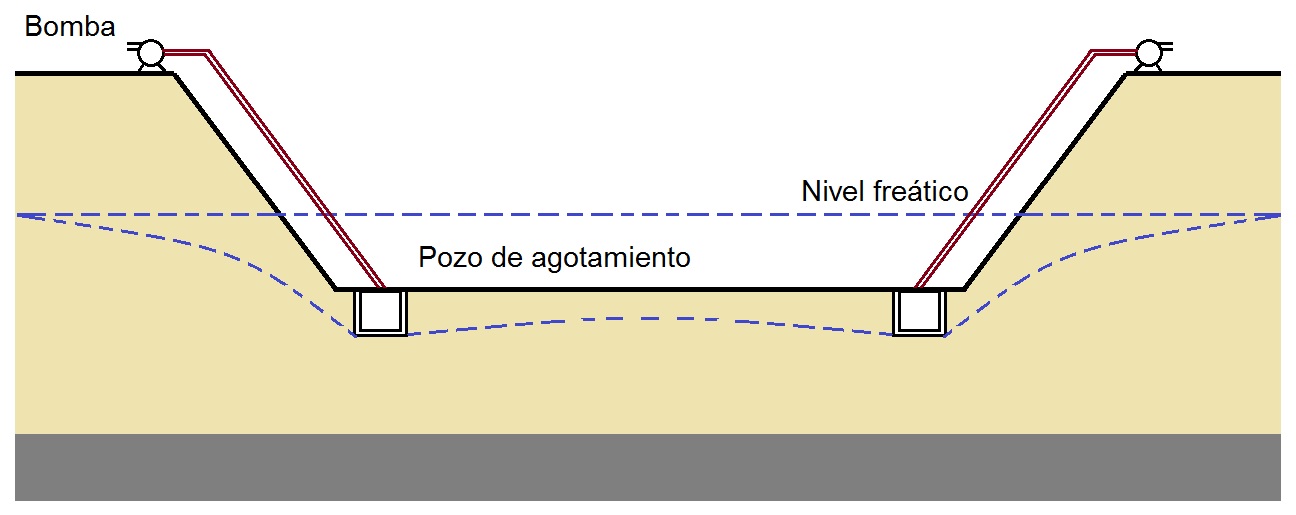 - Drenaje: cuando el objetivo es eliminar el agua: Una de las aplicaciones más contraintuitivas es la del drenaje. En estos casos, el objetivo no es localizar ni aprovechar el recurso hídrico, sino retirarlo del terreno. En grandes proyectos de obra civil, como la construcción de aparcamientos subterráneos o explotaciones mineras situadas por debajo del nivel freático, es imprescindible reducir la presencia de agua. Para ello, se realizan sondeos de achique que permiten extraer volúmenes significativos de agua de forma controlada, garantizando condiciones de trabajo seguras y estables.