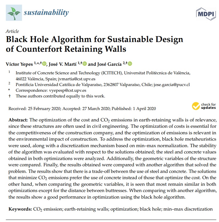 Acaban de publicarnos un artículo en la revista Mathematics, revista indexada en el primer cuartil del JCR. En este artículo se presenta un algoritmo híbrido de búsqueda del cuco y de clasificación no supervisada para optimizar el coste y las emisiones de CO2 de un muro de contrafuertes. El trabajo se enmarca dentro del proyecto de investigación DIMALIFE que dirijo como investigador principal en la Universitat Politècnica de València.