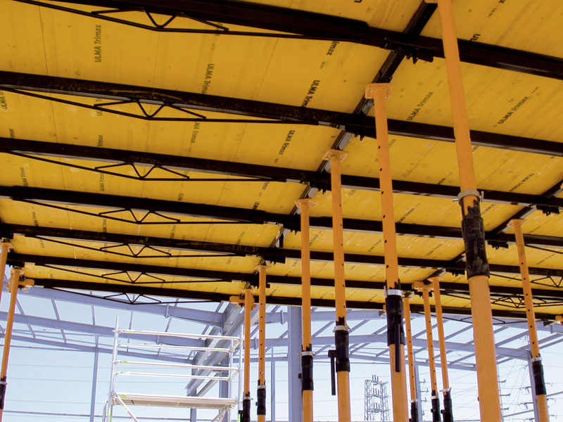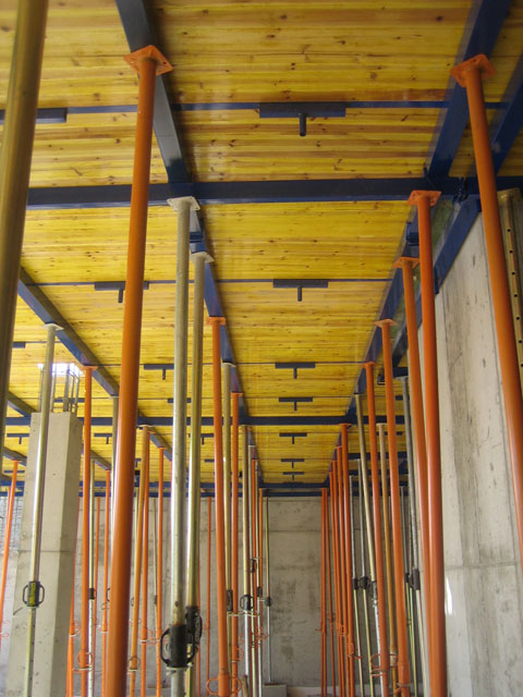 En ciertos casos, se puede diseñar con sistemas de cimbra como soporte estructural o mediante el uso de puntales. Este enfoque se emplea en la ejecución de edificios de múltiples niveles y plantas extensas, permitiendo el hormigonado en fases sucesivas para un máximo aprovechamiento de los recursos. Solo se requiere el material de encofrado para una planta y el apuntalado correspondiente, ya sea para una, dos o tres plantas adicionales.